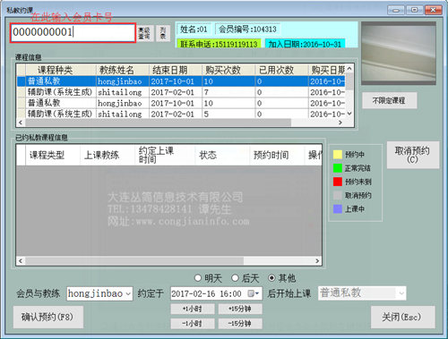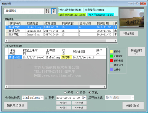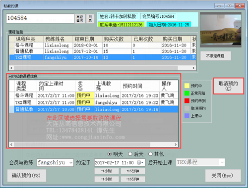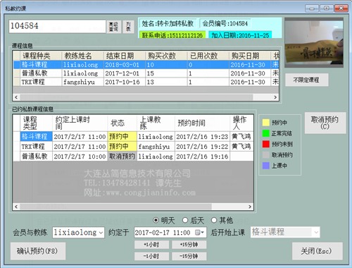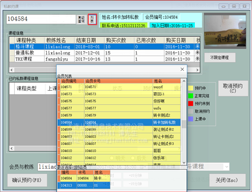 查找到此会员已经购买私教课程,系统会列出此会员注册信息和所有的课程信息。