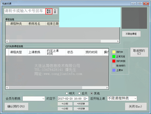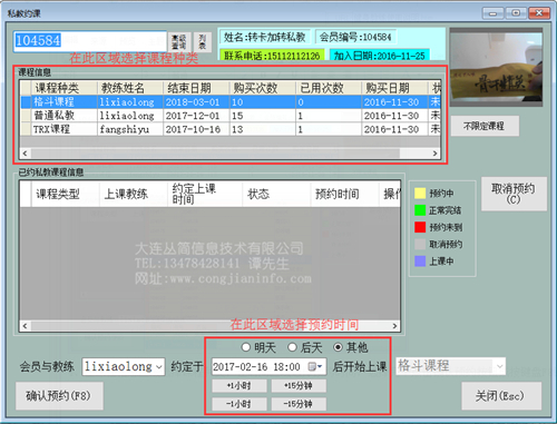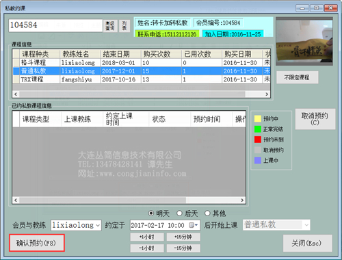 4、在课程信息区域选择课程种类;在时间区域选择预约时间,选择完毕点击确认预约按钮或按键盘F8键确认。